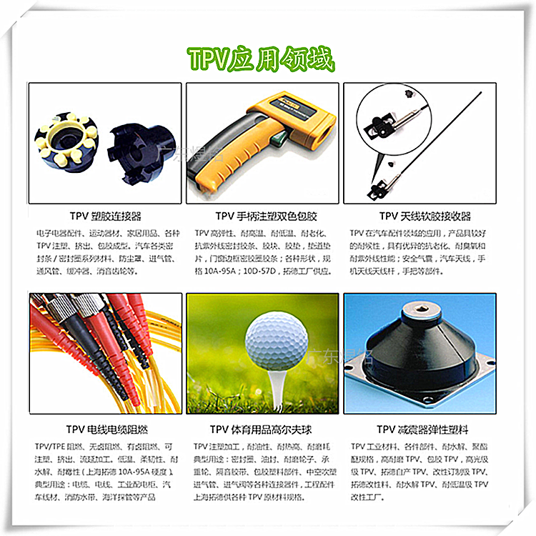它是热塑性弹性体(TPE)系列中的一种软质、黑色、抗紫外辐 射的热塑性硫化弹 性体(TPV)。这种材料同时具有良好的物理 性质和耐化学性,用于较难注塑成型 的领域。这一牌号的山都平 TPV 是剪切速率依赖型产品,可在常规热塑性注塑成 型设备上 加工。这是一种聚烯烃基材料,可在生产过程中进行回收利用。