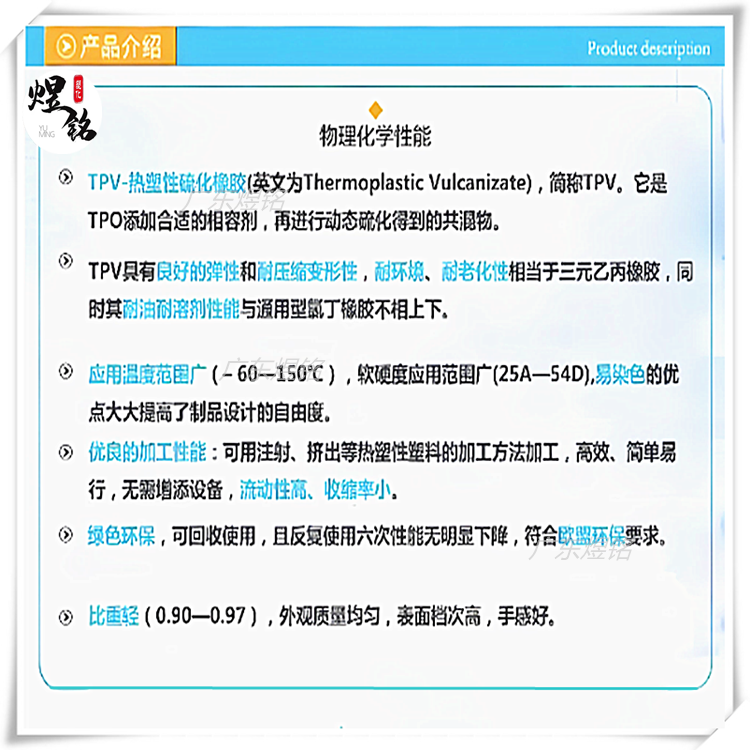 它是热塑性弹性体(TPE)系列中的一种软质、黑色、抗紫外辐射的 热塑性硫化弹 性体(TPV)。这种材料同时具有良好的物理性质和耐化 学性,适用于薄壁或复杂 型材的挤出成型领域。这一牌号的山都平 TPV 是剪切速率依赖型产品,可在常规 热塑性挤出成型、热成型或真 空成型设备上加工。这是一种聚烯烃基材料,可在生 产过程中进行回 收利用。